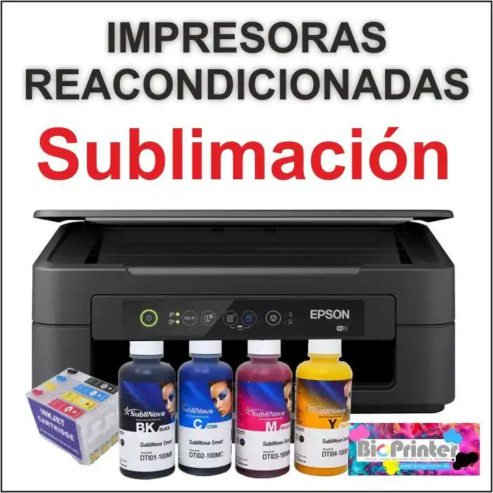 Impresora reacondicionada Epson XP-2100 (o cualquier otro modelo de la gama), pack cartuchos recargables, botellas de tinta de sublimación, paquete de papel y accesorios para el rellenado.