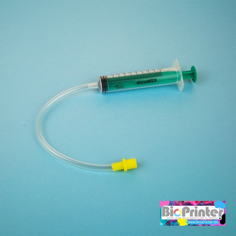 Jeringa 10ml mas tubo transparente flexible y adaptador para la limpieza de los Inyectores o cabezales de impresoras de inyección.Se adapta perfectamente a los inyectores de casi todas las impresoras de las que poseen un cartucho por color.
