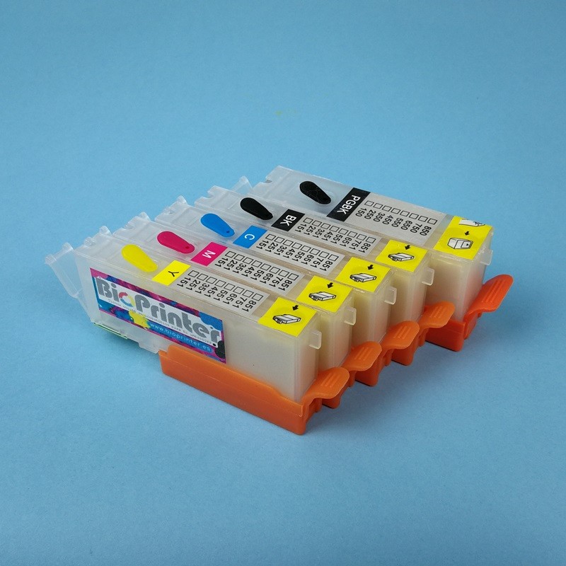 Pack 5 cartuchos recargables vacÃos y autoreseteables BioPrinter, compatibles con impresoras Canon que utilicen los cartuchos PGI-550 y CLI-551. Enfocados para hogar, estudiantes, oficinas, profesionales... utilizando nuestros cartuchos recargables reducirás notablemente los costes de impresión con la misma calidad.