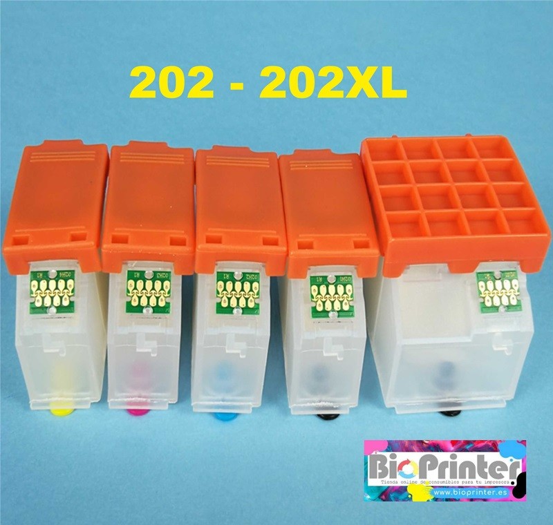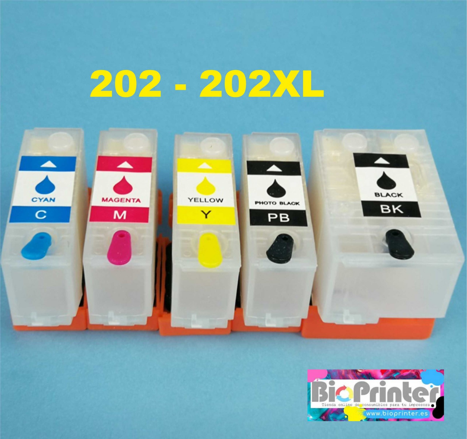 Pack 5 cartuchos recargables vacíos y autoreseteables BioPrinter, compatibles con impresoras Epson que utilicen los cartuchos 202, 202XL, T202 Ideal para casa, estudiantes, oficinas, profesionales... utilizando nuestros cartuchos recargables reducirás notablemente los costes de impresión con la misma calidad.