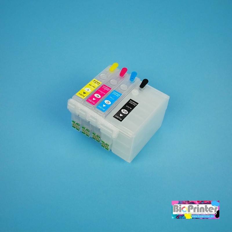 Pack 4 cartuchos recargables vacÃos y autoreseteables BioPrinter, compatibles con impresoras Epson que utilicen los cartuchos 27, 27XL, T27. Ideal para casa, estudiantes, oficinas, profesionales... utilizando nuestros cartuchos recargables reducirás notablemente los costes de impresión con la misma calidad.