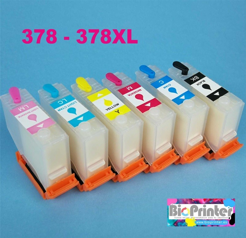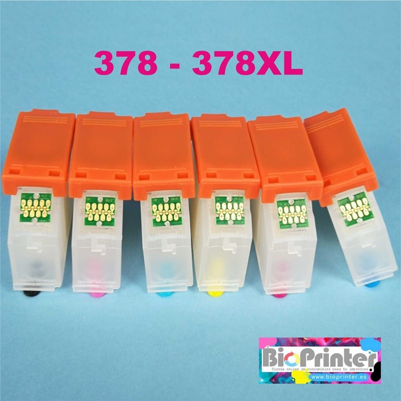 Pack 6 cartuchos recargables vacíos y autoreseteables BioPrinter, compatibles con impresoras Epson que utilicen los cartuchos 378, 378XL, T378. Ideal para casa, estudiantes, oficinas, profesionales... utilizando nuestros cartuchos recargables reducirás notablemente los costes de impresión con la misma calidad.